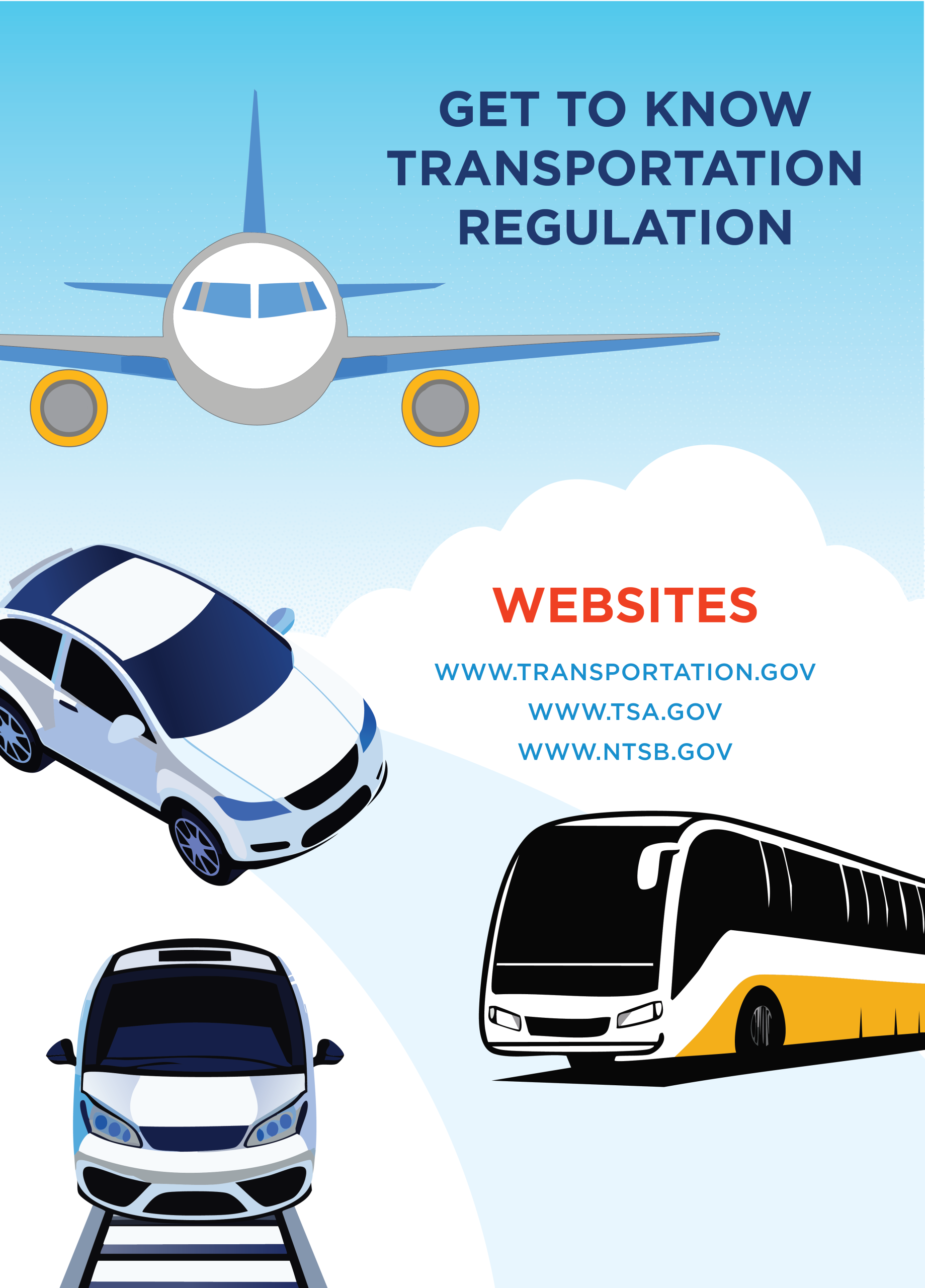 Several organizations and departments aid in the communication and regulation of transportation in the United States. The U.S. Department of Transportation (USDOT) is a federal agency responsible for regulating and overseeing national transportation systems, focusing on safety, efficiency, and sustainability. The Transportation Security Administration (TSA) works with airports, public transit stations, and freight docks to prevent or prosecute security threats within the U.S. transportation system. The National Transportation Safety Board (NTSB) oversees the investigation of transportation-related accidents such as plane crashes, train derailments, and major vehicle incidents. The NTSB also works to create safety recommendations for legislation. These agencies, among many others, work to keep our transportation system safe, efficient, and sustainable while maintaining a quality guest experience.
