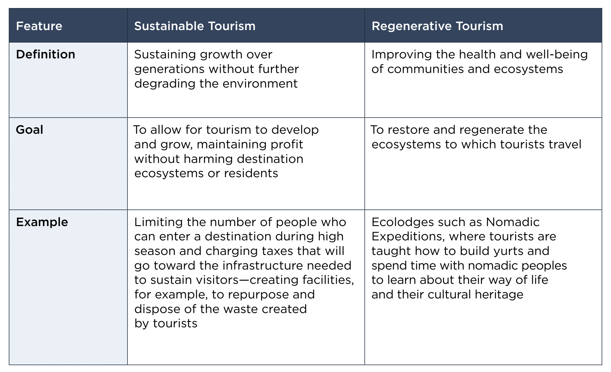 A table, laying out the definitions, goals, and examples of sustainable tourism and regenerative tourism. Definitions: sustainable, sustaining growth over generations without further degrading the environment; regenerative, improving the health and well-being of communities and ecosystems. Goals: sustainable, to allow for tourism to develop and grow, maintaining profit without harming destination ecosystems or residents; regenerative, to restore and regenerate the ecosystems to which tourists travel. Examples: sustainable, limiting the number of people who can enter a destination during high season and charging taxes that will go toward the infrastructure needed to sustain visitors - creating facilities, for example, to repurpose and dispose of the waste created by tourists; regenerative, ecolodges such as Nomadic Expeditions, where tourists are taught how to build yurts and spend time with nomadic peoples to learn about their way of life and their cultural heritage.
