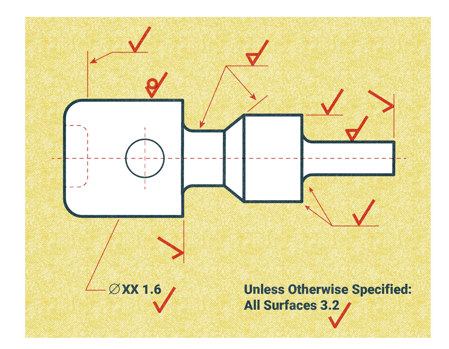 The basic symbol used for surface texture is (✓), a rather simple check mark. The purpose of surface texture marks is to call out specific surfaces on the print for which the surface finish is specified.