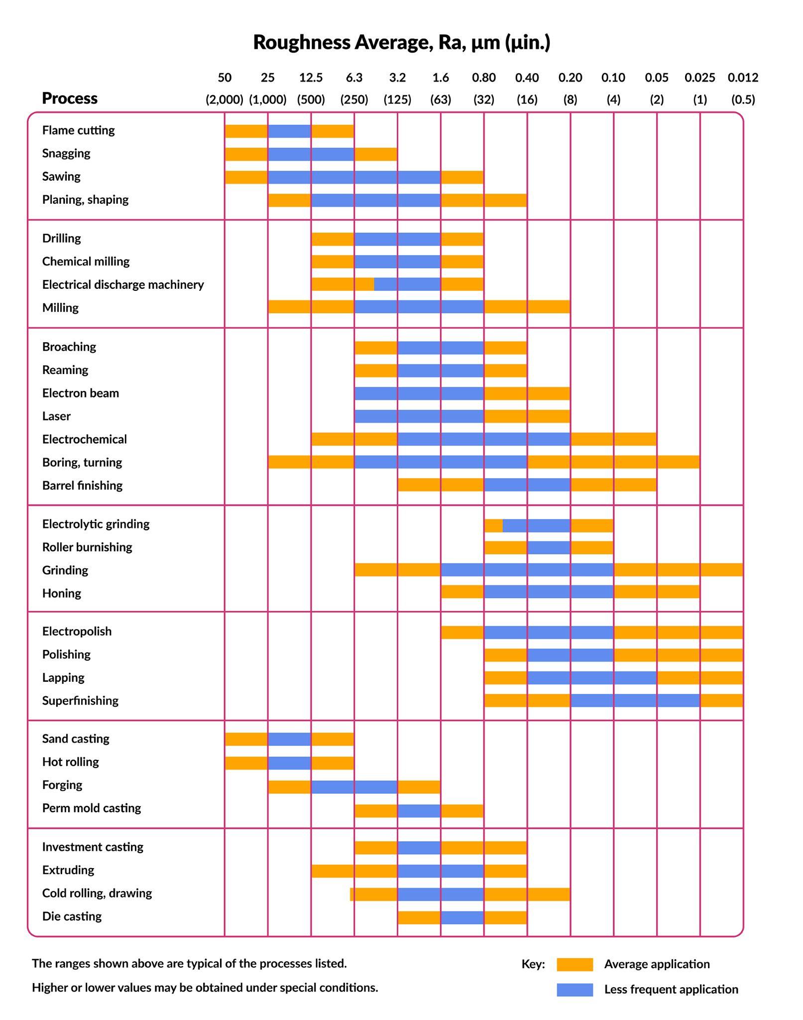 The figure above is a common graphic found in the industry. The graphic tells us several things about surface finish. This is a basic two-axis diagram where the top section represents desired surface finishes in both metric and inch. The inch callout is in parentheses.