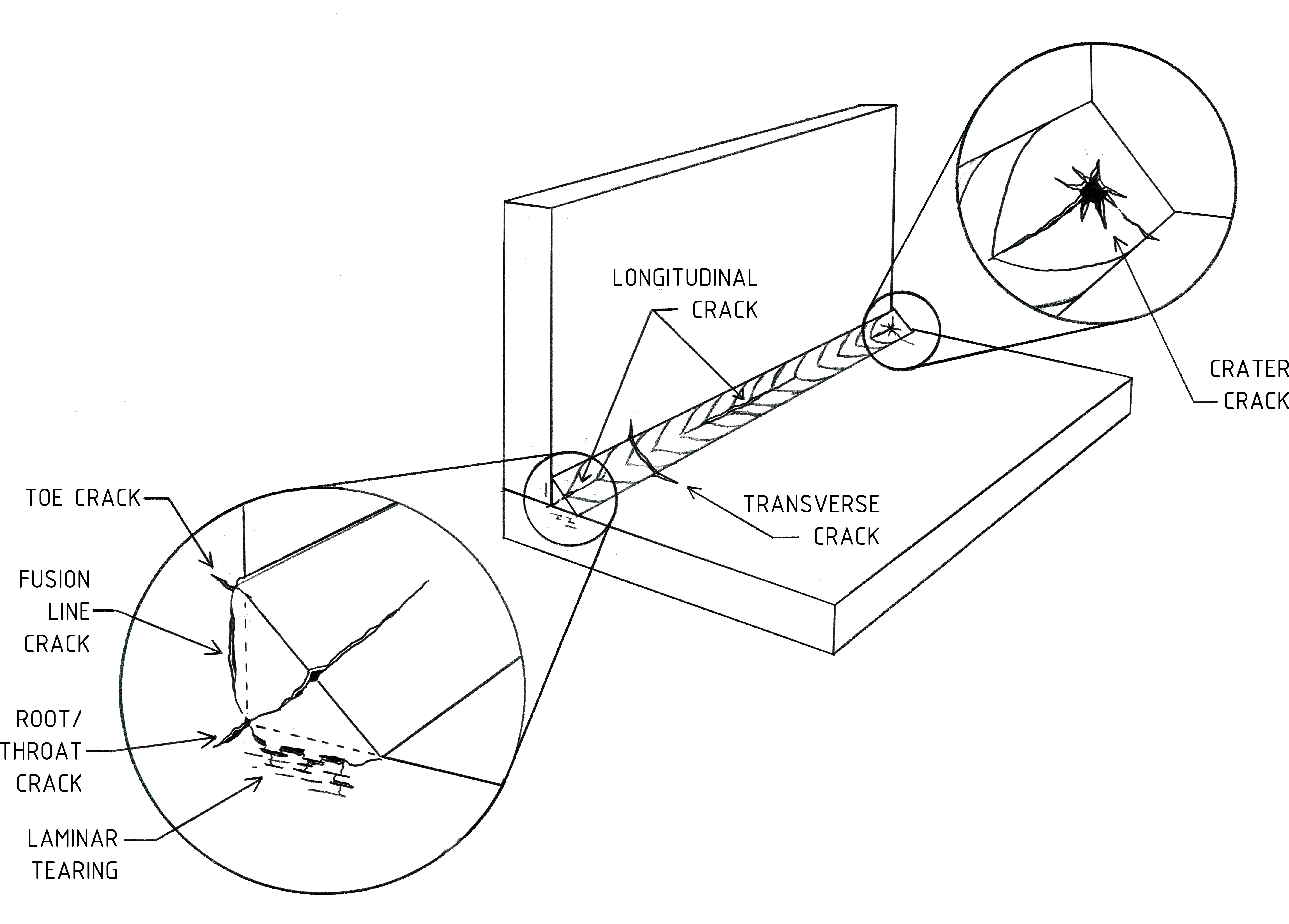Cracks will rarely appear in a straight line. They will nearly always appear along the path of least resistance. Cracks may occur in the weld, the heat affected zone (HAZ), or the base metal when the localized stress exceeds the ultimate strength of the metal.