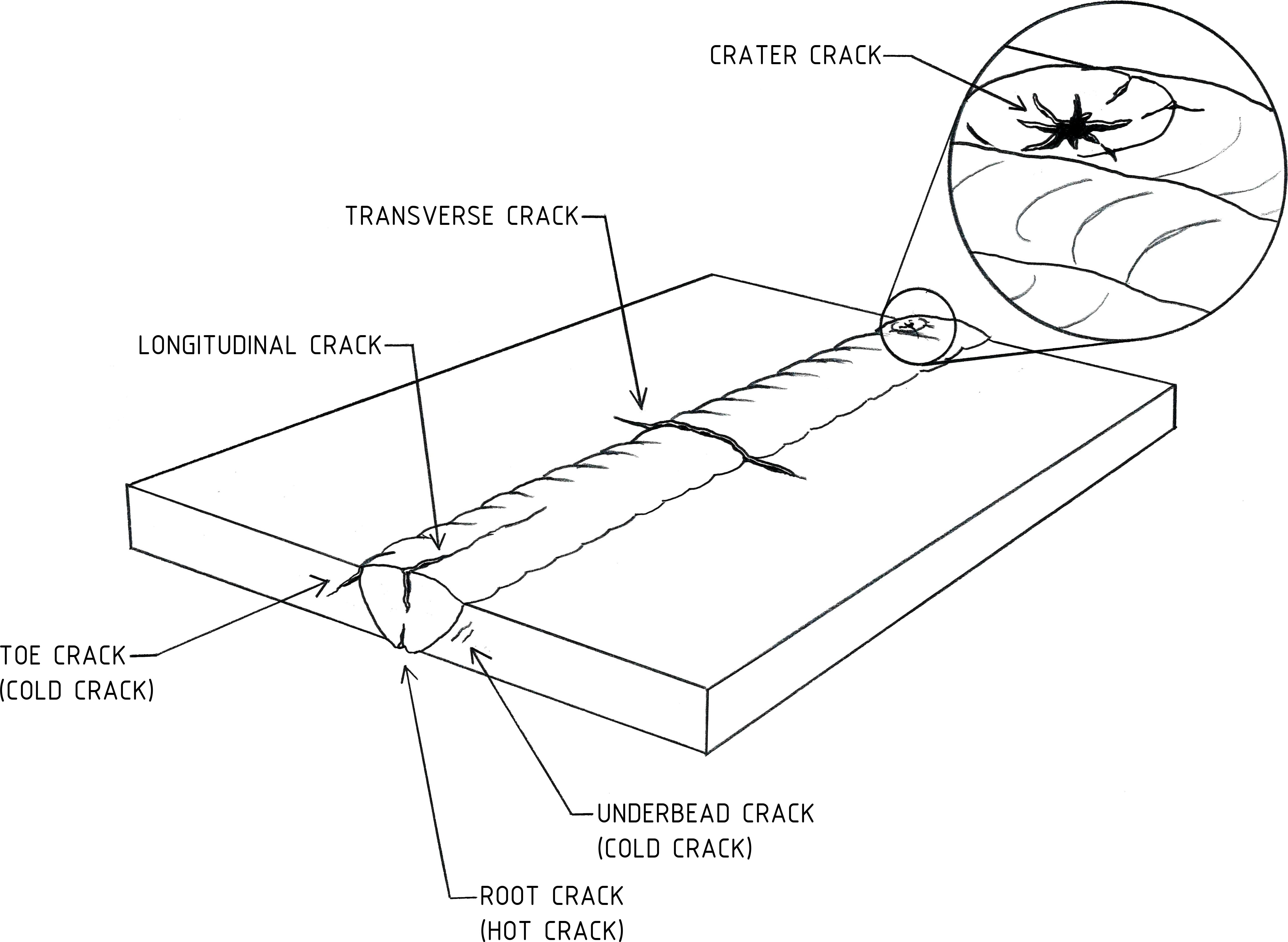Cracks are classified as hot cracks or cold cracks, and may be longitudinal or transverse in their orientation.