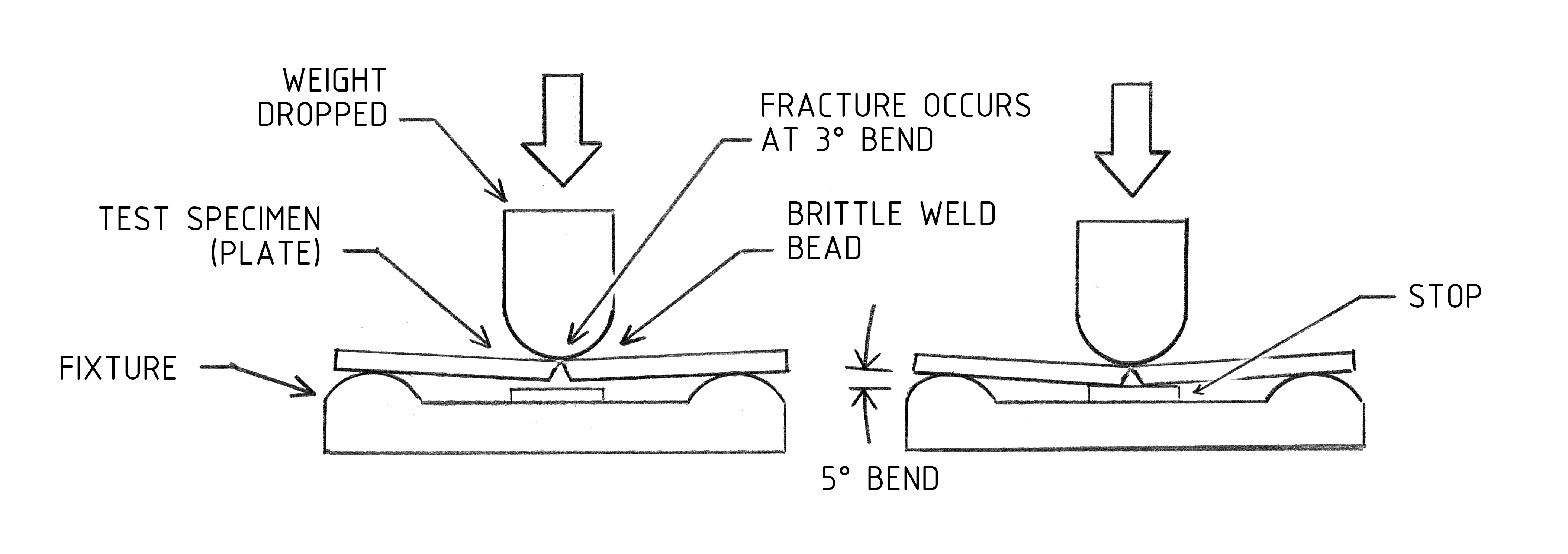 Cracking of the weld bead is initiated at 3° of bend. After that point, the weld bead continues to crack, which initiates a fracture in the plate. To ensure the strain induced in the plate is elastic, a stop is placed below the weld bead. The stop limits the amount of deflection of the plate to 5° of bend.