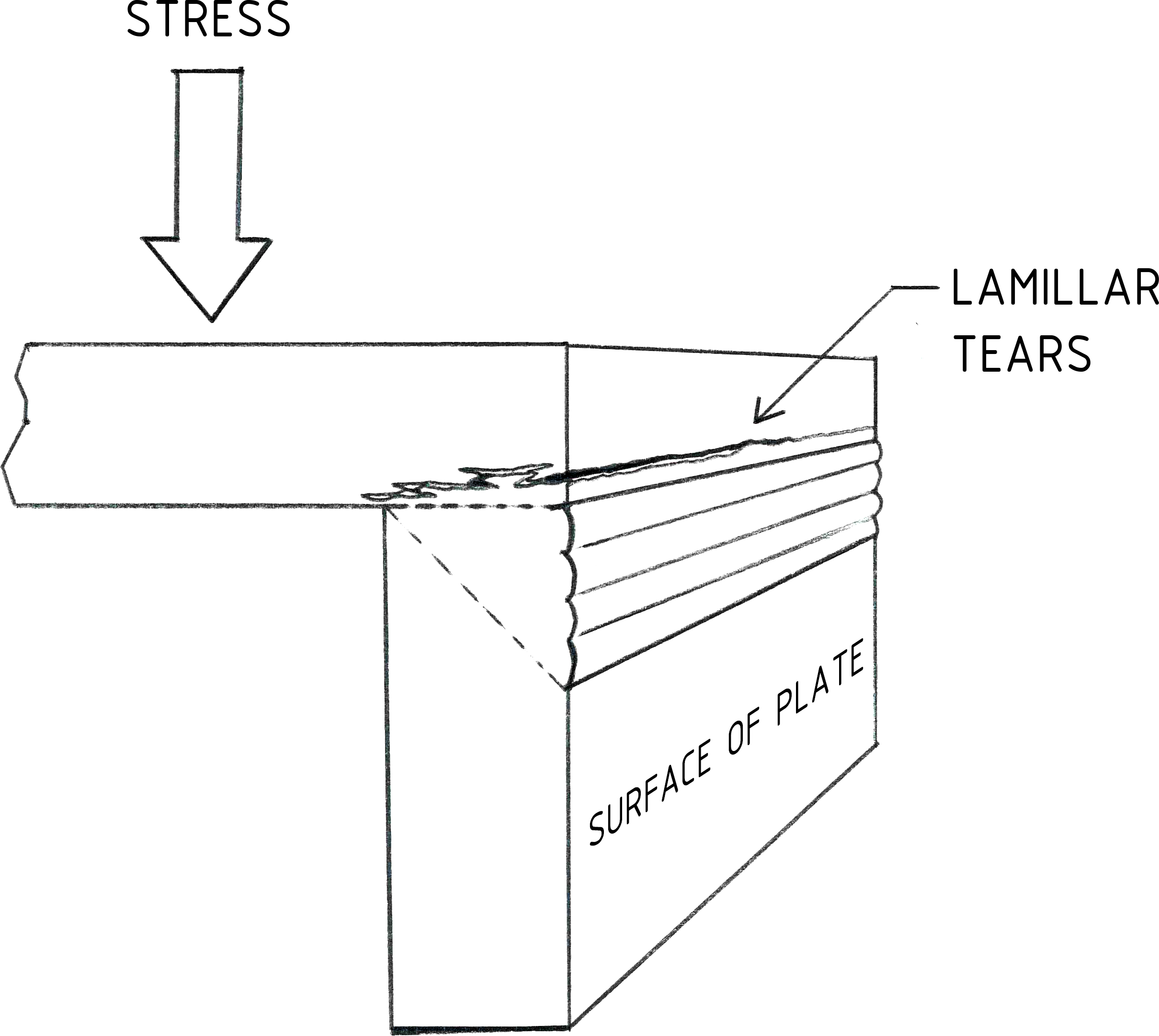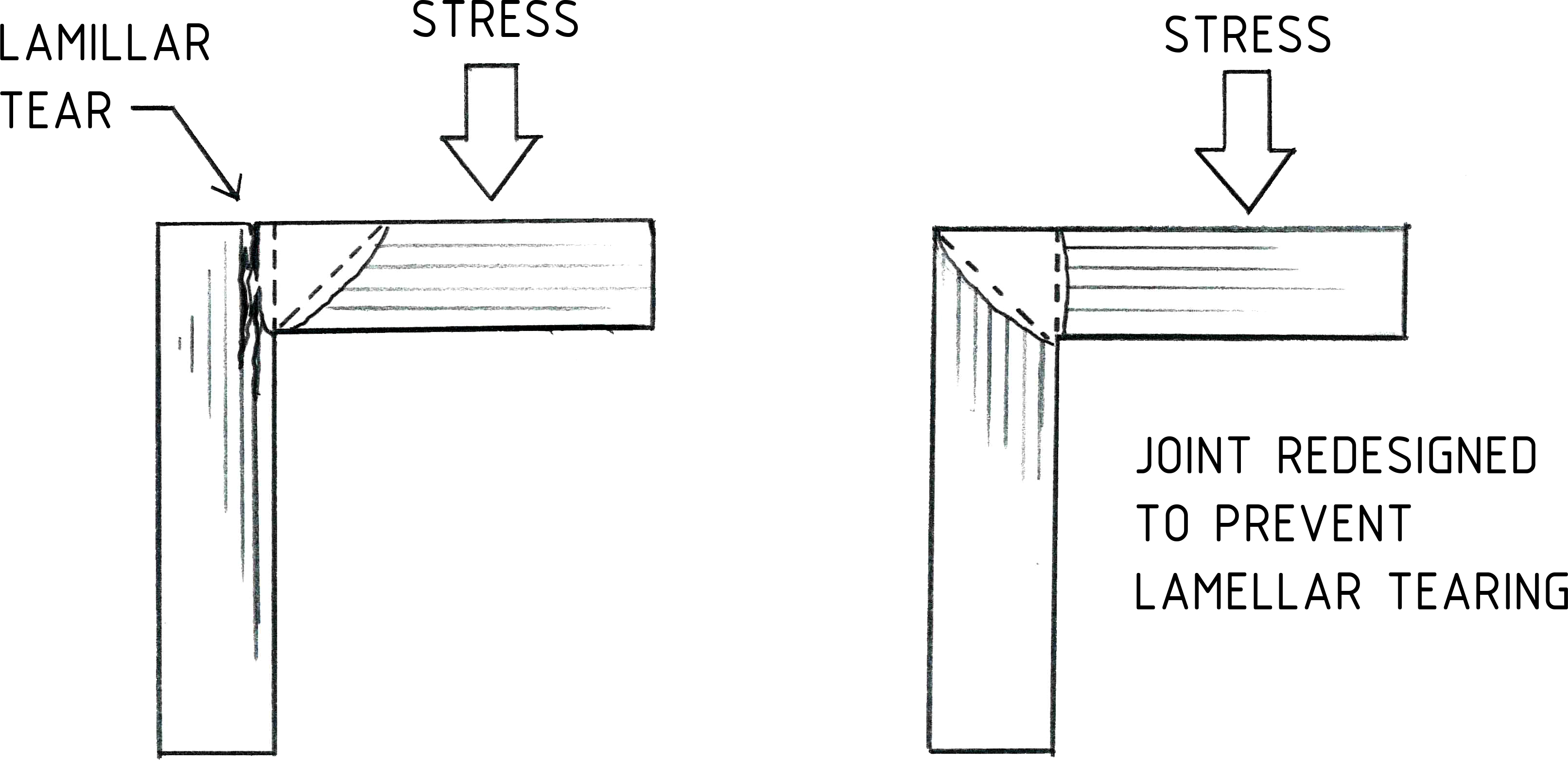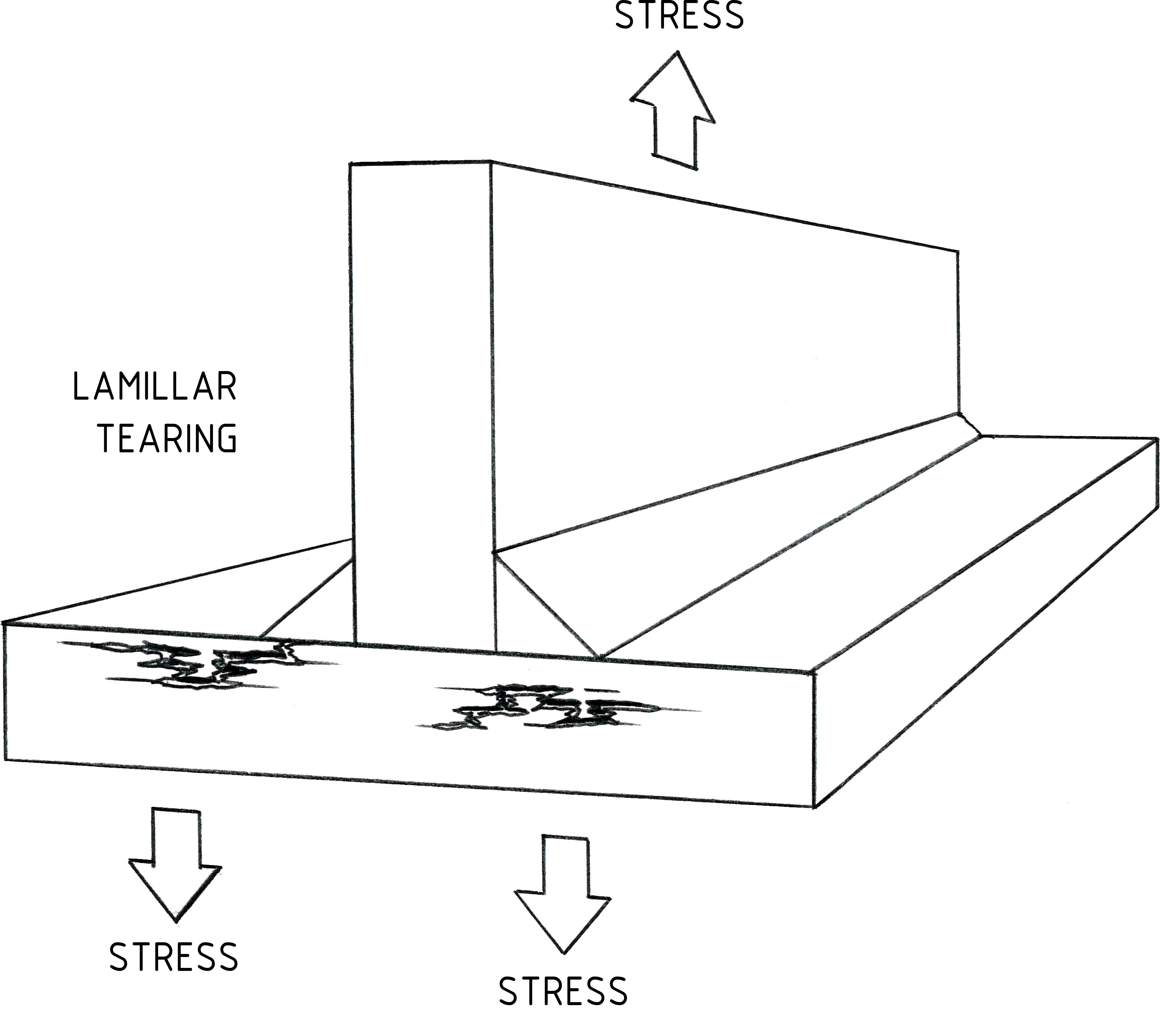 T-joints may be especially susceptible to lamellar tearing. The two members of a T-joint are located at approximately right angles to each other in the form of a T. Under these conditions, high tensile stresses can develop perpendicular to the mid-plane of the steel plate. The magnitude of the tensile stresses depends on the size of the weld, the welding procedure, and the amount of joint restraint imposed by the welding design.
