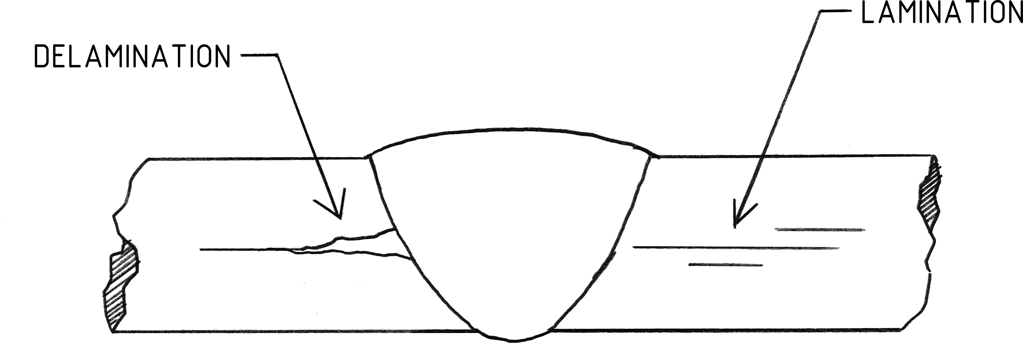 The primary difference between the two is that a lamination is a base metal discontinuity that occurs during steel making, whereas delamination occurs when the base metal is worked.