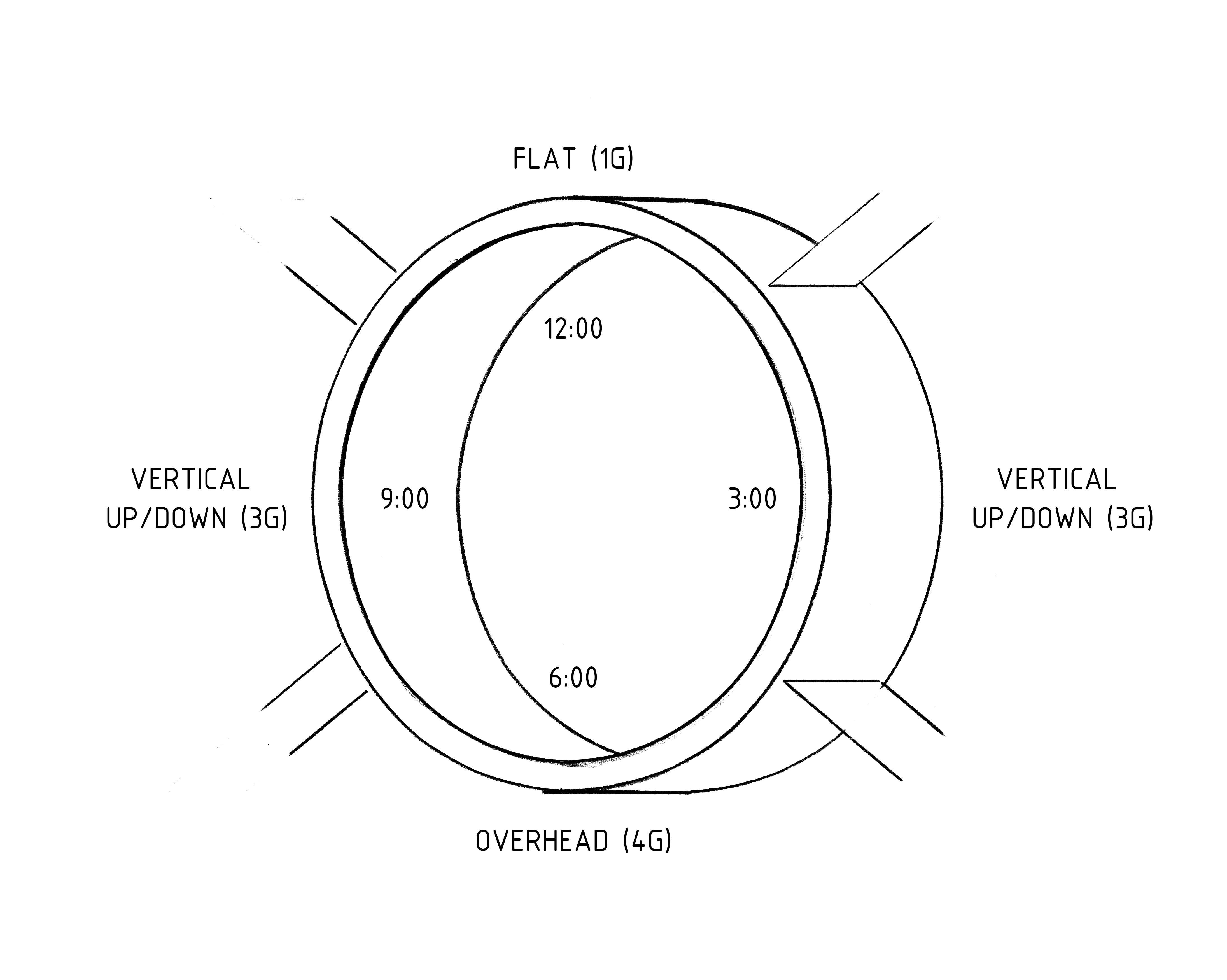 • 6F (multiple, fixed): the pipe axis is approximately 45º and welding is done in the overhead, horizontal, and flat positions.