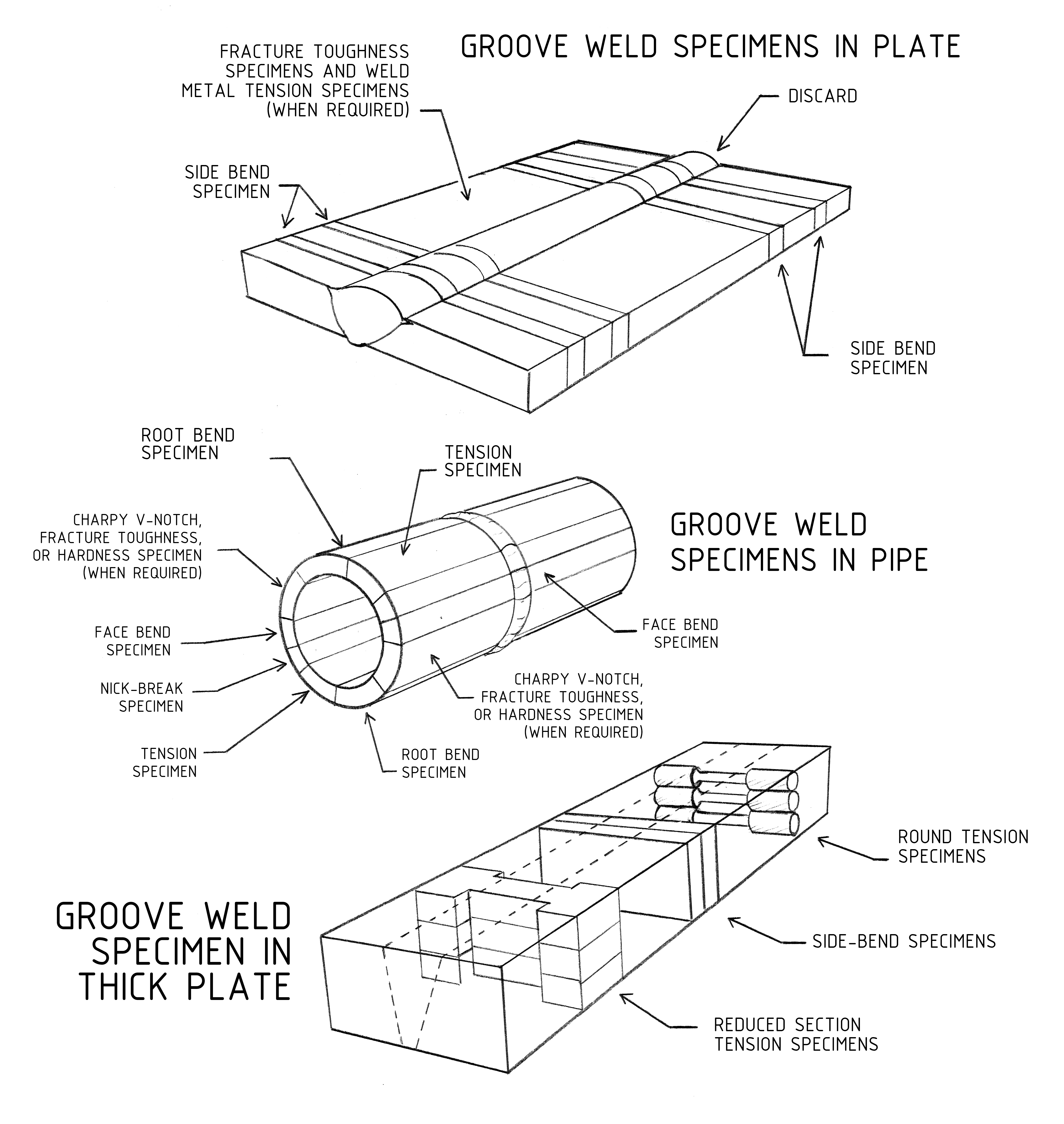 Mechanical test specimen preparation is described in AWS B4.0, Standard Methods for Mechanical Testing of Welds. Specimen preparation may vary according to the type of weld. Groove weld specimens must be taken from specific locations in plate and pipe welds to ensure accurate results.