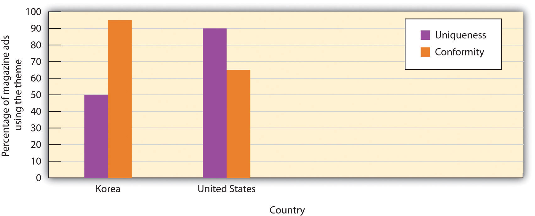 Kim and Markus (1999) analyzed advertisements from popular magazines in the United States and in Korea to see if they differentially emphasized conformity and uniqueness. As you can see in Figure 7.10 “Culture and Conformity”, they found that while U.S. magazine ads tended to focus on uniqueness (“Choose your own view!” and “Individualize”) Korean ads tended to focus more on themes of conformity (“Seven out of 10 people use this product” and “Our company is working toward building a harmonious society”).